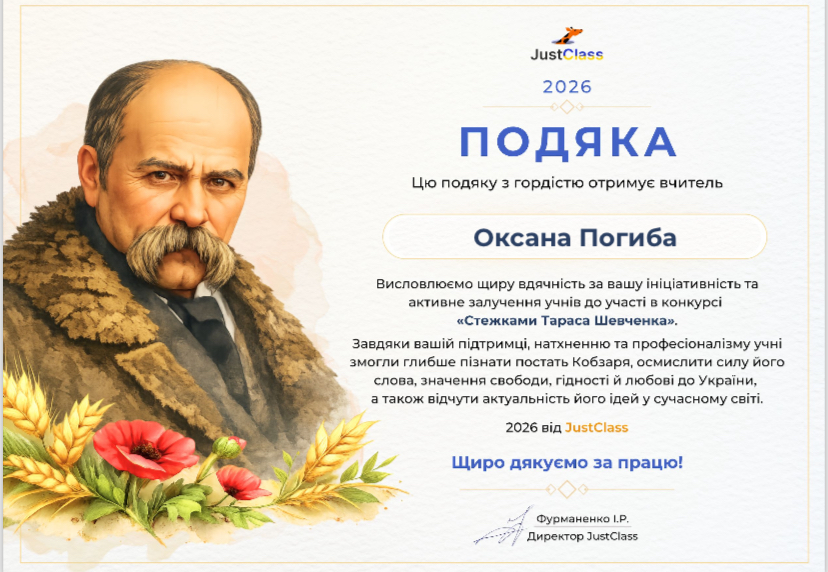 Конкурс «Стежками Кобзаря», присвячений постаті Тараса Шевченка — символу української нації, її сили, гідності та незламного духу, тривав із 9 до 16 березня 2026 року на платформі JustClass.