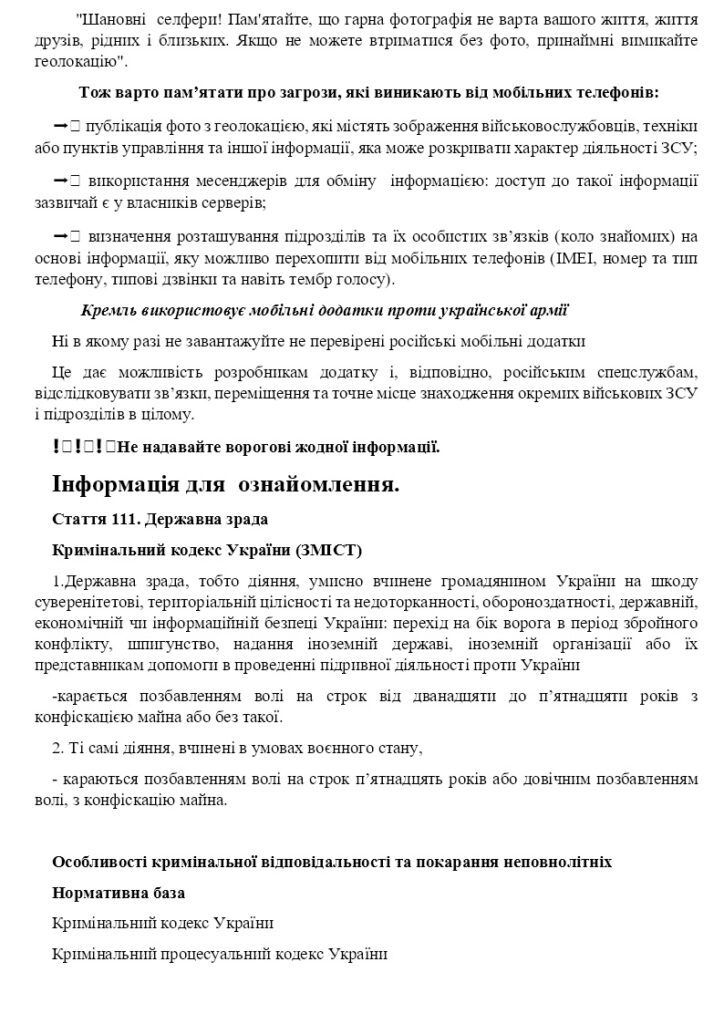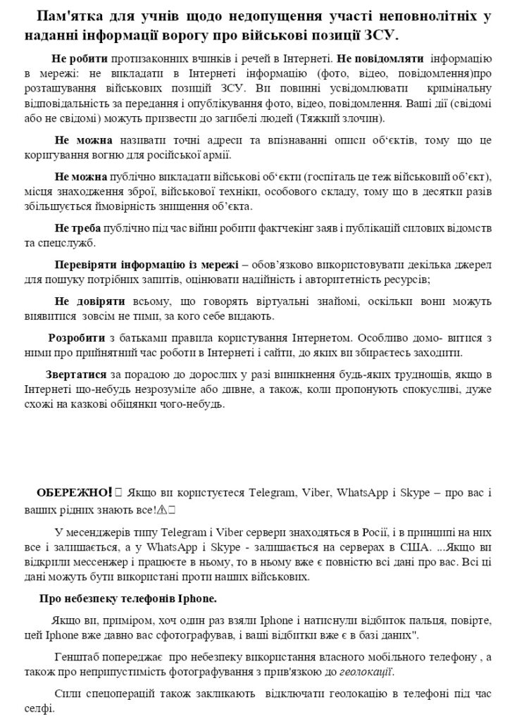 Пам’ятка для здобувачів щодо недопущення участі неповнолітніх у наданні інформації ворогу про військові позиції ЗСУ
